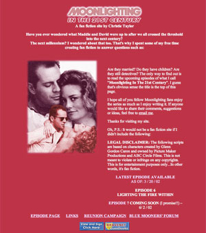 Between 2002 and 2005 this site was the flagship for the Moonlighting Reunion Campaign. But it didn't start out that way. The original purpose for moonlighting21.com was to create an up-to-date fan fiction series (Moonlighting In The 21st Century) and sharpen my skills as a script writer (that's why the stories are done in television script format).